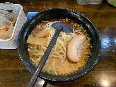 街道沿いに一軒だけあるラーメン店です。壁に貼られた豚めんのポスターがいかにも美味しそうでこれにしようかと思ったのですが、総量1kg自信のある方向けとなっており、自信がないので撤退しました。ニラ南蛮ラーメンに麻油を入れてもらいます。キムチとニラの漬物が別に出てきます。コッテリ系のラーメンは久々ですが、美味しかったです。