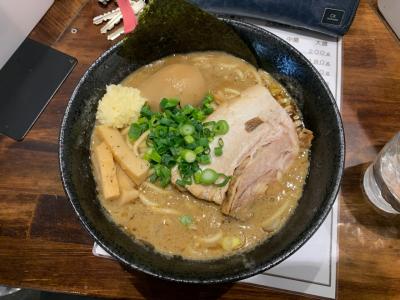 多賀城の住宅街にあるラーメン屋です。人気店らしく並んで順番を待ちます。とんこつ味玉のせ(980円)をお願いしました。箸が立ちそうなドロドロのスープに驚きます。麺は無料で大盛(200g)にしてもらえます(してもらいました)。美味しいけど、ヘヴィなラーメンです。夜までお腹が空きませんでした。