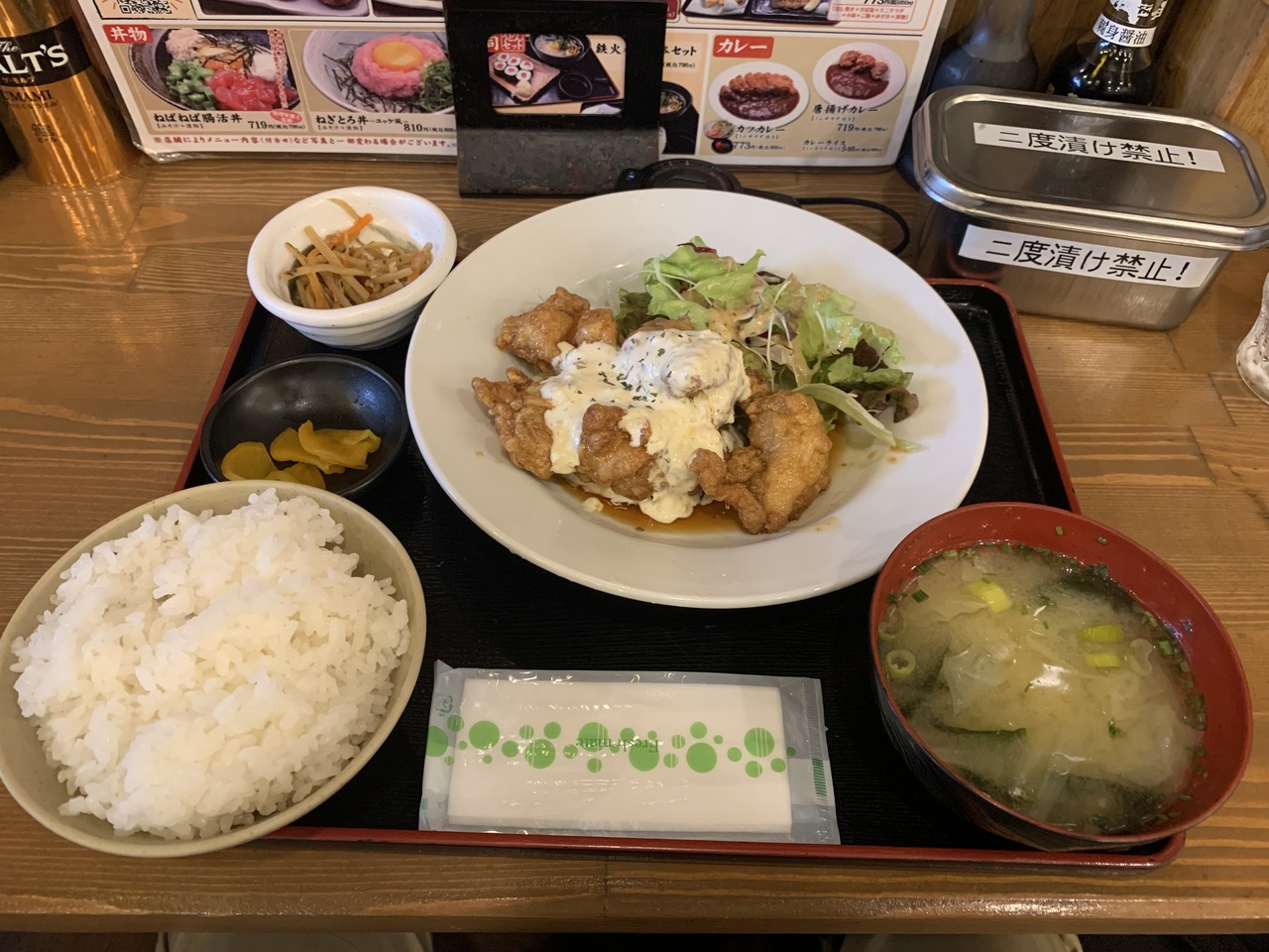有名なラーメン屋shinshinに行ったら大行列! 待ってまで食べる気もないので、近くにあったこちらでランチ。満マルは関空近くの店舗に行ったことがあります。 チキン南蛮定食をいただきました。唐揚げを卵味でいただきます。柔らかい唐揚げがウマー。お値段も手頃で、これは正解でした。