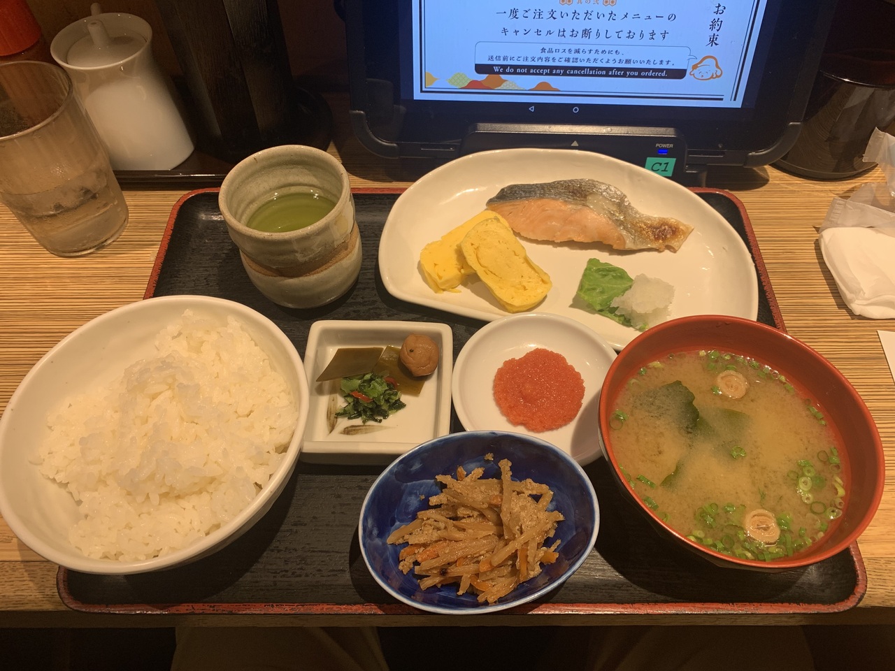 福岡を離れ際に、こちらで朝食です。近くの明太子食べ放題の店を狙ったのですが、長蛇の列でした。ここはうどんのお店ですが、ご飯ものをいただきました。焼き鮭の定食に明太子を付けてもらいます。