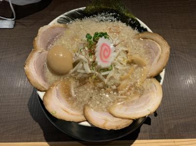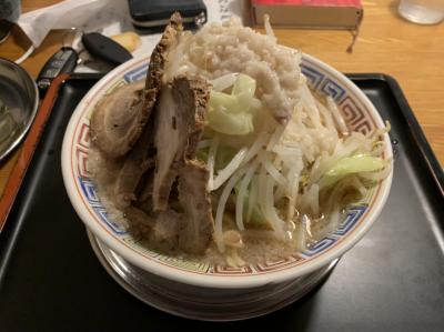 山形市の街道沿いにある二郎インスパイア系ラーメンの店です。一人でランチをいただきました。堆く積もったモヤシの頂上には、背脂もどっさり。チャーシューもどデカい。それらを片付けて現れる極太縮れ麺が美味しいです。思い切り健康に悪いラーメンを堪能しました。