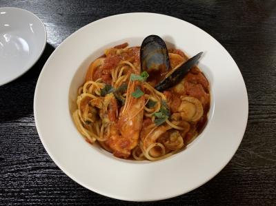 イオン東根店の近くにあるイタリア料理店です。一人で夕食をいただきます。ペスカトーレロッソをお願いしました。和室で食べるイタリアンはちょっと面白い感じ。