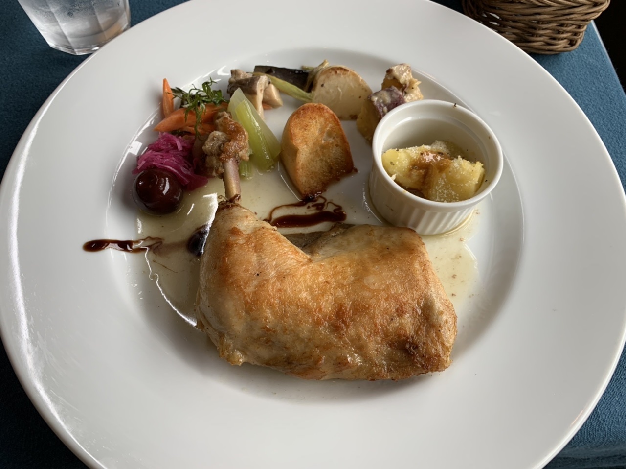 街道沿いにポツンとあるレストランです。外観はレストランなのかよくわからず、入るのに少し勇気がいるかも? メニューは基本的にイタリアンのようです。ランチに入り、鶏モモのコンフィをいただきました。野菜の付け合わせが色とりどりで美しいです。ほろほろに柔らかい鶏モモが美味しかったです。サラダ、スープ、フォカッチャorライスが付いています。