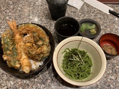 イオンモール名取の一階にある天ぷらの店です。一人でランチに入りました。野菜天丼と茶そばのセットをいただきます。野菜天丼は海老、かき揚げ、かぼちゃ、ピーマンが載っています。明太めかぶが食べ放題なので、おかわりをいただきました。やはり天ぷら専門店の天丼は美味しいですね。