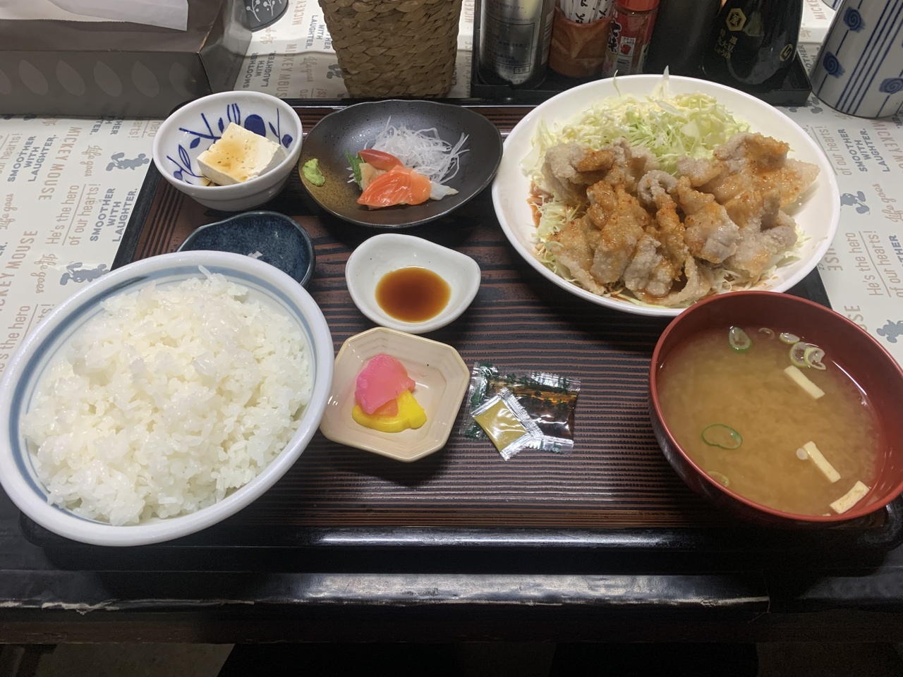 地元で人気があると聞き、一人でランチをいただきました。なるほど、また12時前なのに、ほぼ満席です。日替定食を選びます。揚げ豚の定食です。ほんの味見くらいの量ですが、刺身もついています。満足感はすごいですね。翌朝の体重が増えました。