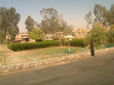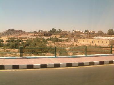 シャトルバスはアブシンベル神殿に向かって進みます。ドーム型の建物はホテ...