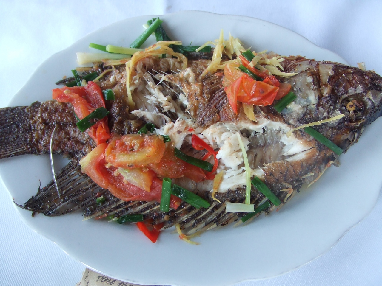 まず、揚げ春巻き(チャー・ゾー)をヌックマムに漬けて頂きます!!o(@^◇^@)oゆでたエビ(大盛り)と上海ガニ、黒鯛の煮物(写真の魚、塩味が効いていておいすぃ~★)空芯菜の炒めもの(ザウ・ムォン・サオ・トイ)と意外においしかった白ごはん。途中で水上生活者の家に到着、彼らからシャコとか買えまっせ、みたいな話がガイドから聞きつつも目の前の食事がおいしくてがっついてしまいました。あぁ・・・彼らにとっては観光客は命だろうに、誰も降りないままティエンクン洞に到着してしまったのでした。- 旅行時期