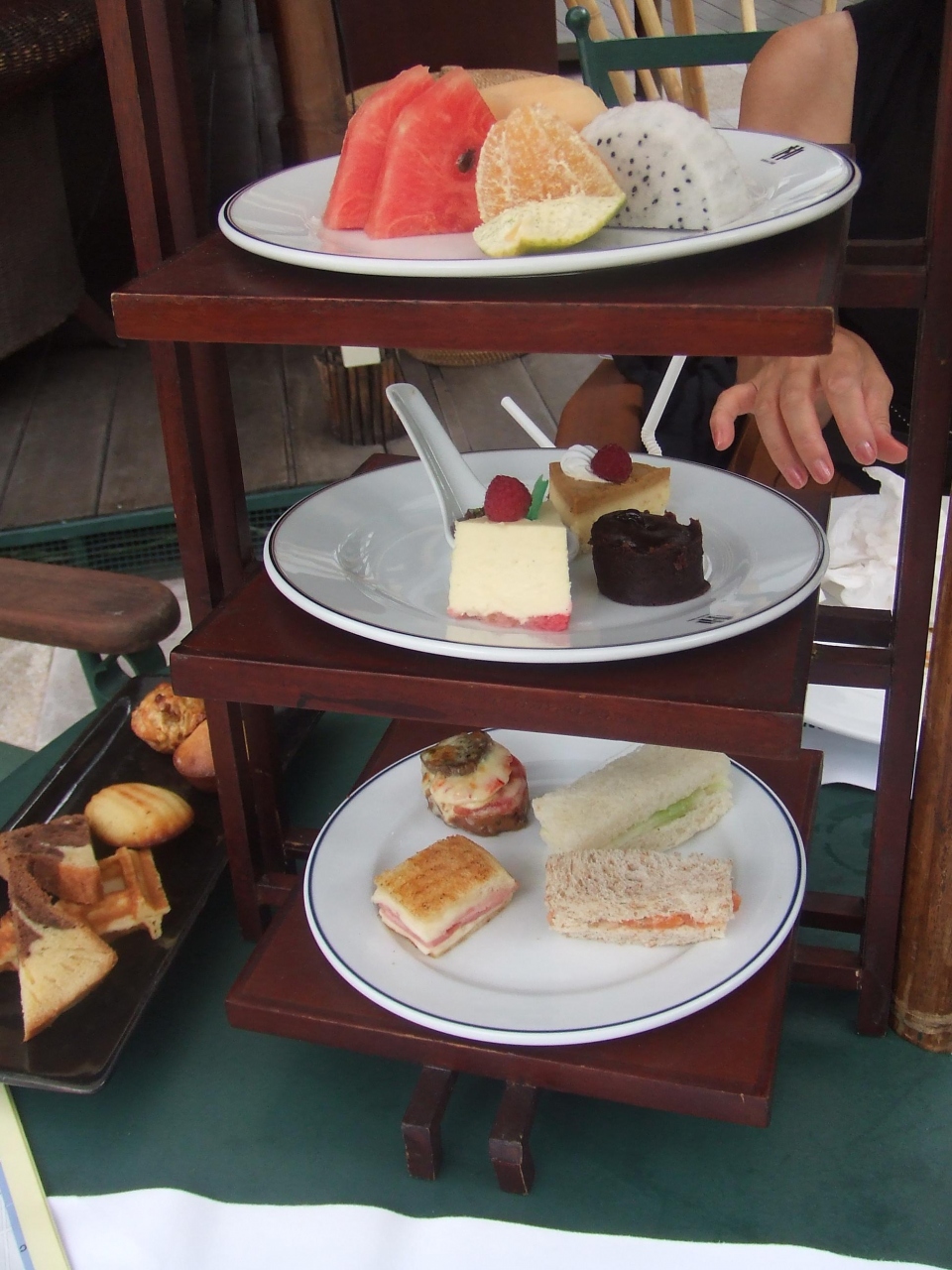 写真のように上段からフルーツ、生ケーキ、サンドイッチ、別プレートで焼菓子もありました★☆かなり満足!!15時~17時という時間帯だけが微妙なのですが・・・