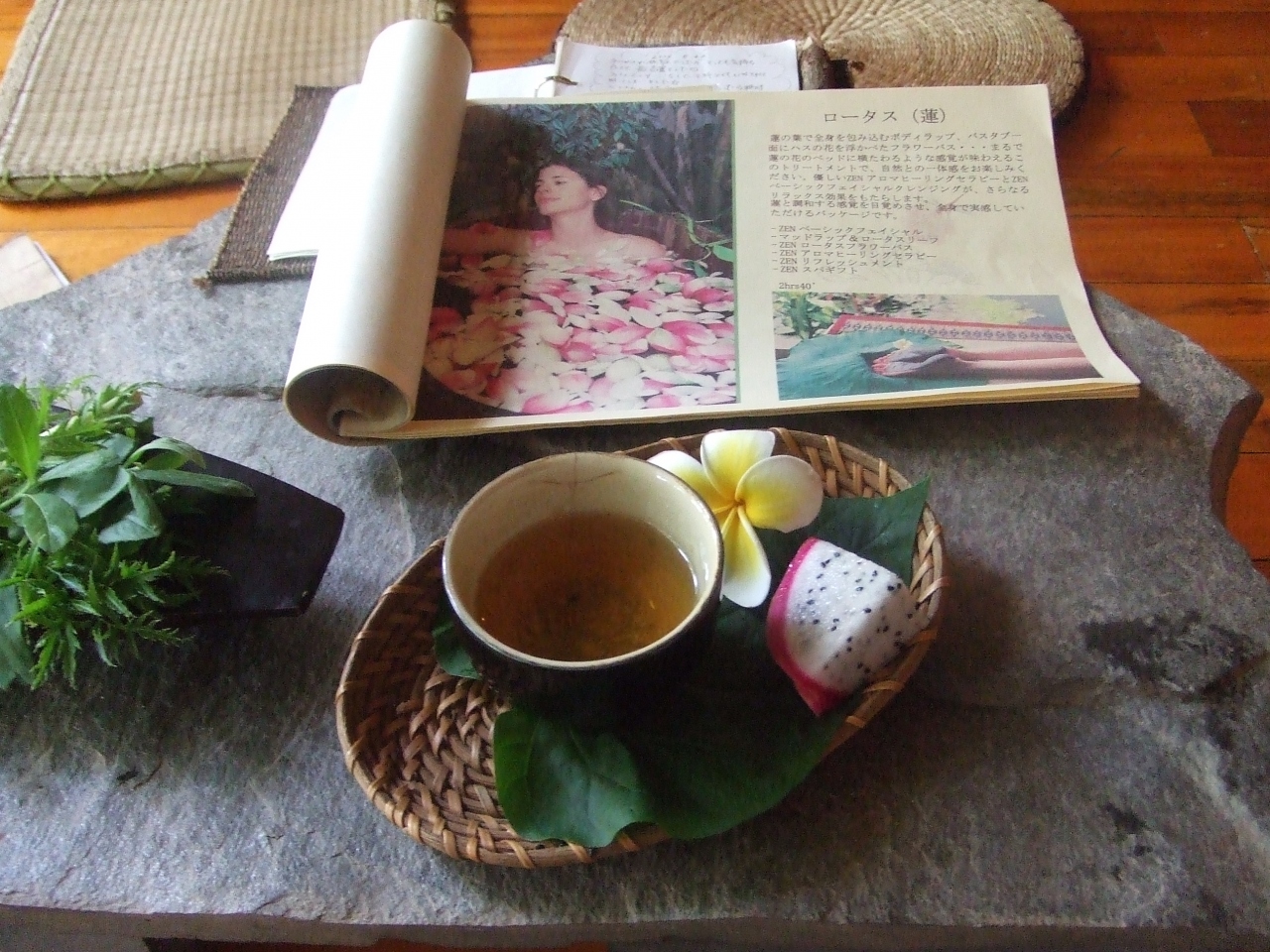 お店に案内されるとお茶を飲みながらゆっくりメニューを選びます。予約は絶対しておかないと混み混みみたいですが、だいたい何時間くらいのコースとだけ言っておけばお店でじっくり考えてOKでした。私はLotusというコースを選択。