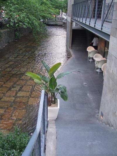 コンクリート打ちっぱなしの外観。TIMESビルの中の、道路面の高さから川のレベルに1フロア降りたところのお店。目線に川が入ってきてとても涼しげ(≧∇≦)照明はすこし落としてあってくつろぎの雰囲気です。ケーキの盛り付けも、店員さんの感じも良くて長居のできるお店でした。(● ̄(エ) ̄●)ノ☆