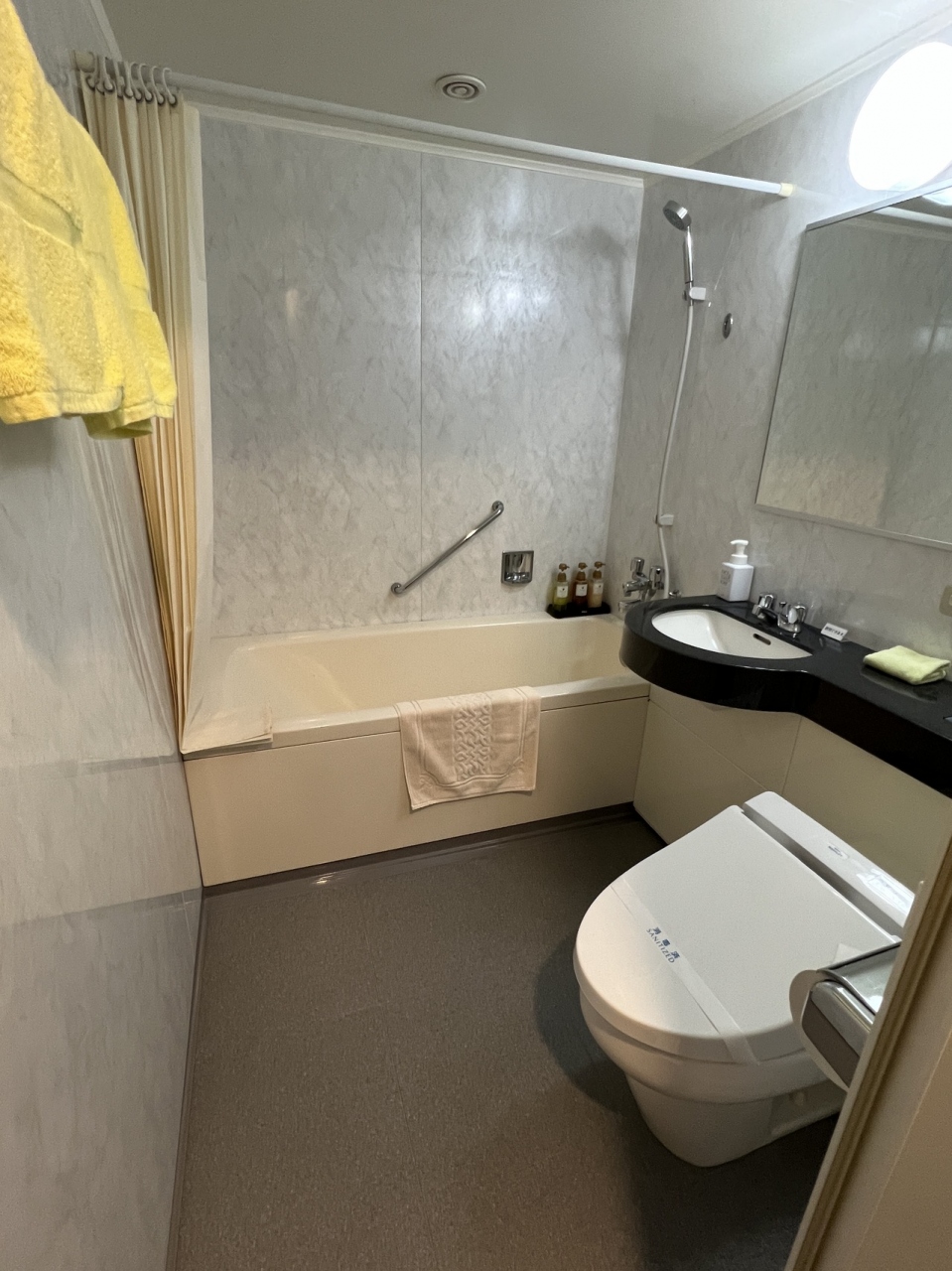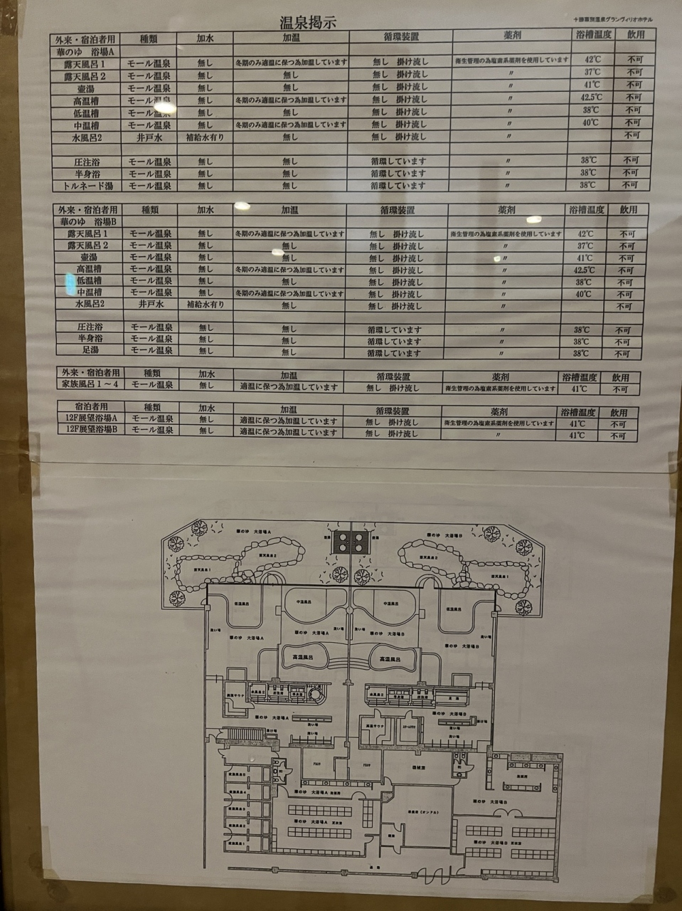 まず一階にある日帰り入浴施設に行きましたが、塩素臭が気になってすぐに6階の宿泊者専用温泉へ入り直しました。こちらは浴槽もとても狭く洗い場は2つしかないのですが、加温源泉かけ流し。