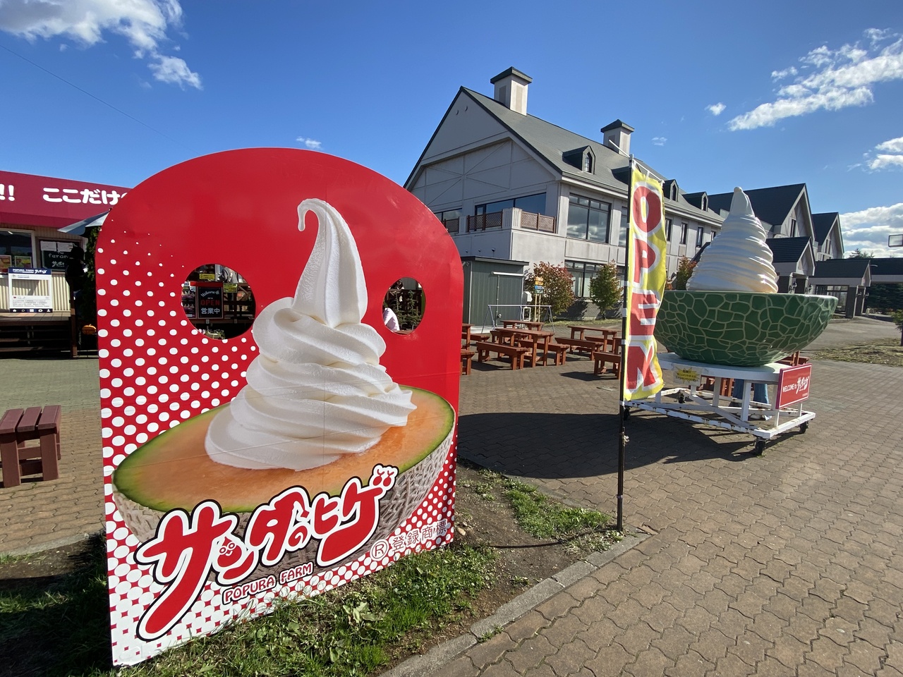 アイスが食べたいと言ったら、相方がこちらへ寄りました。メロンの上にソフトクリーム「サンタのヒゲ」で有名なポプラファームさん