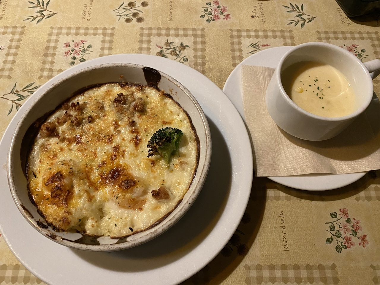 それだけでもありがたいのに、メニューが豊富です。いつもは選ばないデザート付セットにしました。メインはドリア。