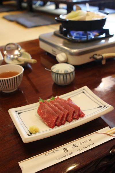 地元出身の後輩のおススメということで、下調べせずにランチで訪問。クルマは店の敷地内に停めて、直ぐに店内へ。お座敷に通されて、馬肉鍋と馬刺定食をオーダー。近くの席では地元の営業の人でしょうか?ちょっと奮発ランチみたいな感じで仲良く食べていました。