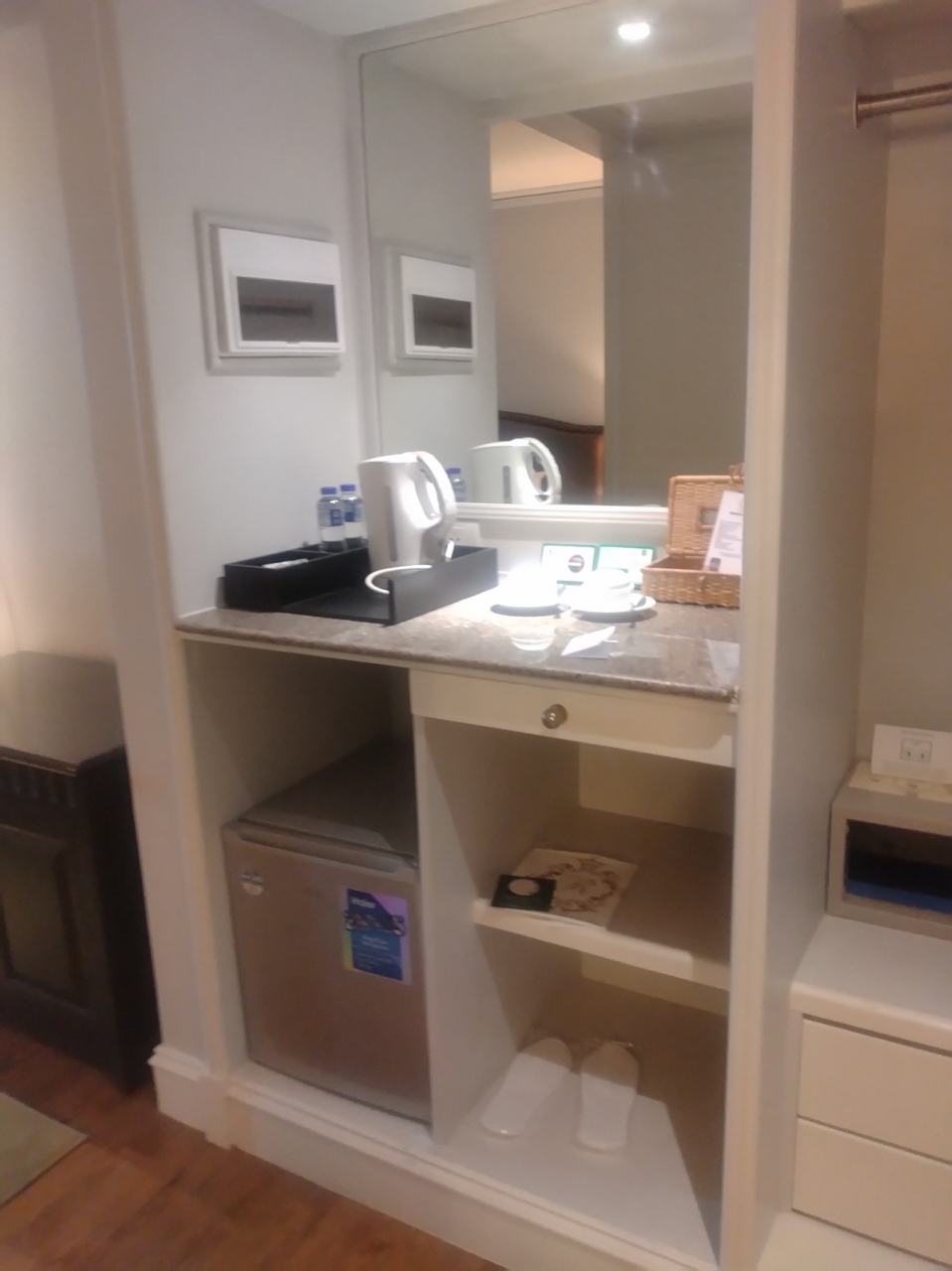 前にはアパートメントホテルとして使っていたらしくて、食器棚やシンクがあります。ただ、今は電子レンジとコーヒーメーカーだけ、食器とカラトリーがあるだけでも便利なのに。