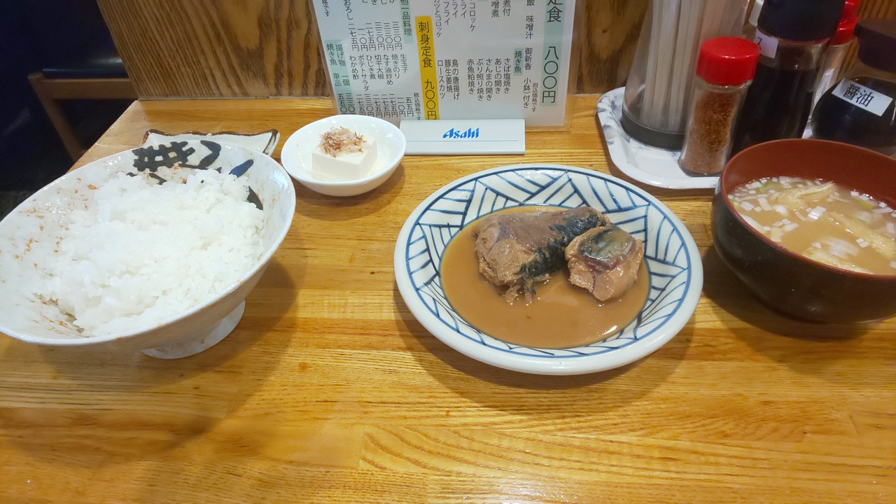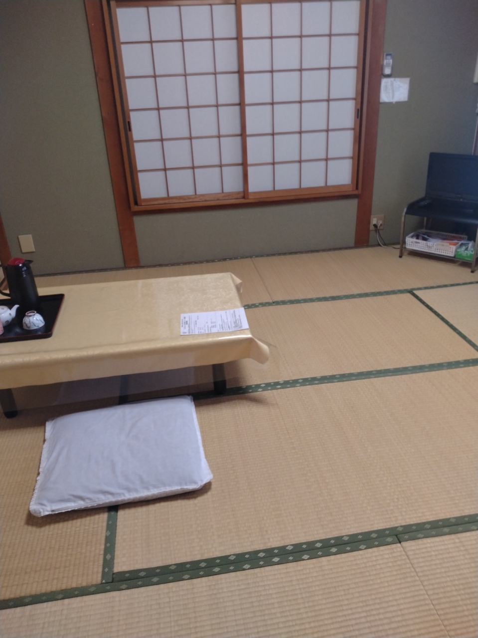 一階が魚中心の居酒屋、二階が宴会場だったらしく障子で仕切って宿泊客の部屋としている。当然、隣の音はダダ漏れ。部屋には小さいテレビとエアコン、お茶のセット、座椅子もないので背中が痛くなる。