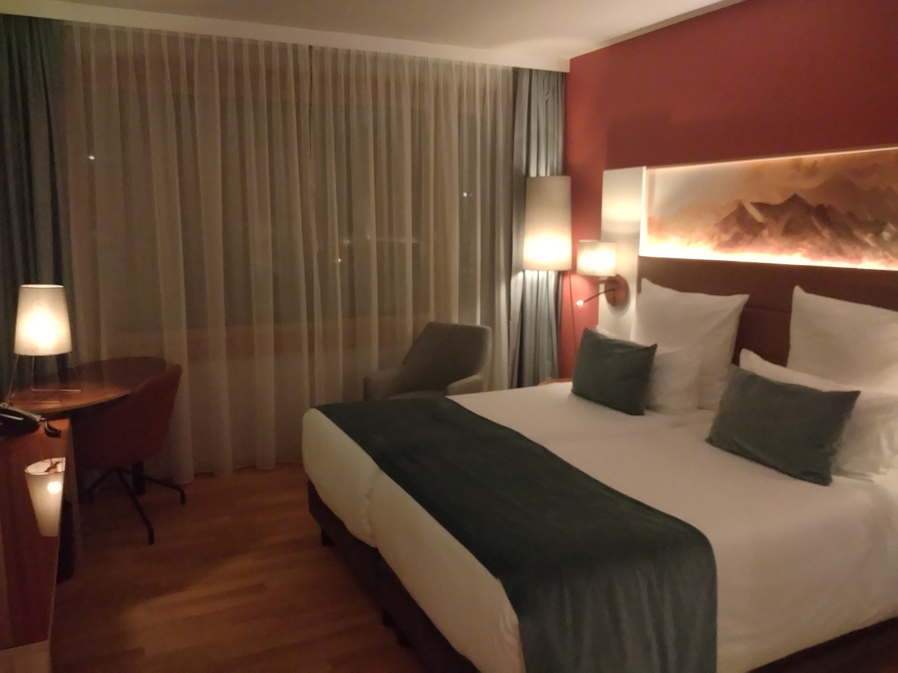 ベッドは最近流行りのパッと見1クイーンベッド、セパレートして2シングルのタイプ。ただセパレートするとやや狭いかな。