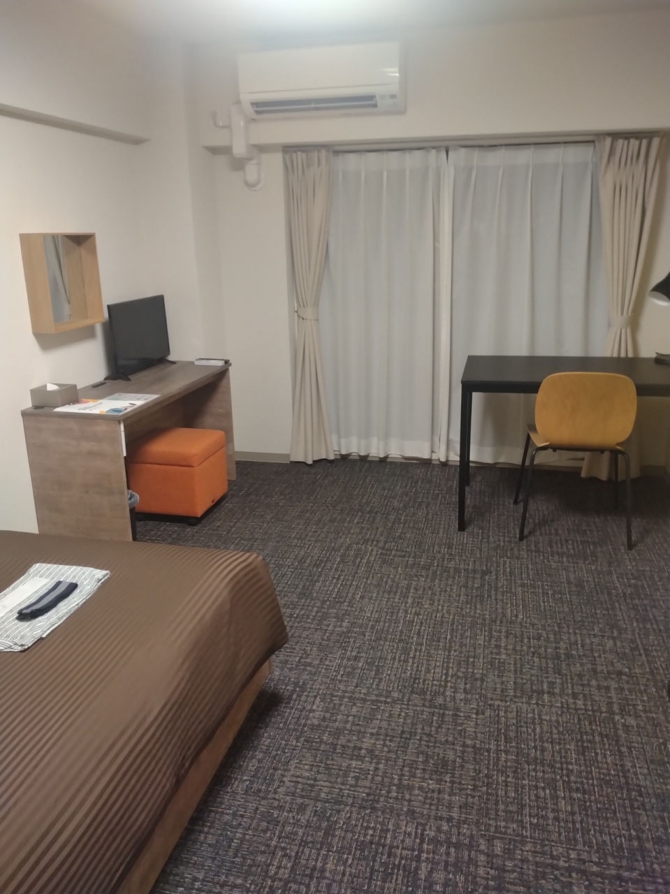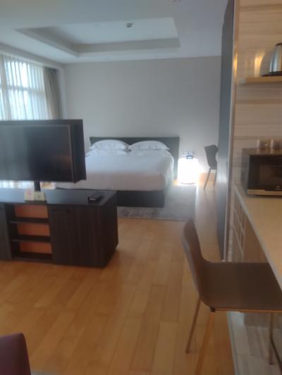 部屋は綺麗です。ホテルフロントから歩いて10秒のところにコンビニがあるし、使い勝手はいいです。部屋も機能的につくられてるんだけど、いかんせん椅子が一個もない。それとケトルが壊れててお湯が作れませんでした、