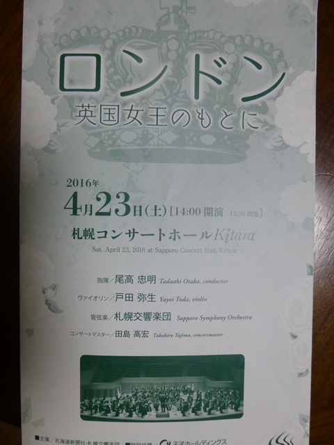 札響のこの日のプログラムは「ロンドンー英国女王のもとに」と題した英国作曲家のコンサート。指揮は英国エリザベス女王からも勲章を授与された尾高忠明。咲きかけた桜が風に揺れていた、気持のよい午後でした。コンサートも英国の雰囲気が感じられる素晴らしいプログラムでした。
