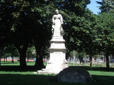 広場の真ん中に立つ、おそらくヴィクトリア女王の像だと思うのですが、芝生...