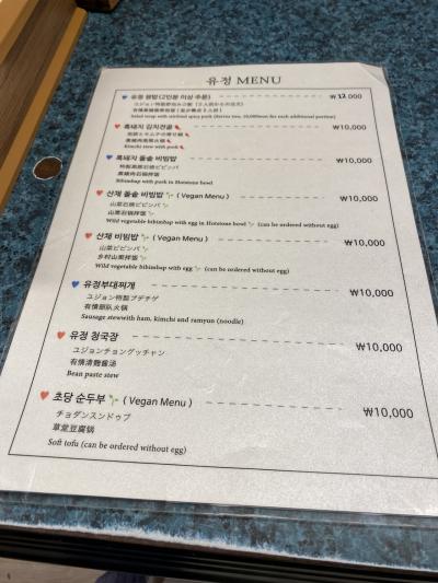 たくさんのパンチャン(おかず)とケランチム(茶碗蒸しと卵焼きの中間の食べ物)、キムチチゲ、トビッコ海苔ご飯付き定食です。おまけ?でカンジャンセウ(エビ)も2匹付いて2人前99600ウォン(12000円弱)と安くはないですが満足度は高いです。