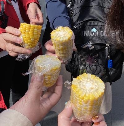 ちょっとした食べ物のお店がいくつかあり、ソフトクリームと迷った結果、蒸しとうもろこしを採用!