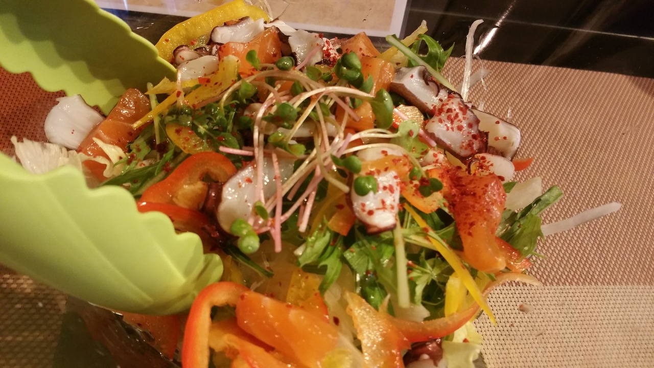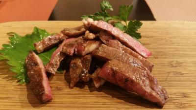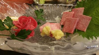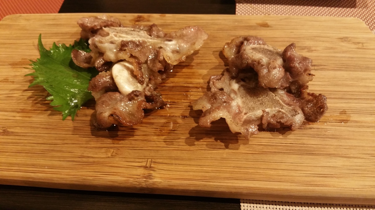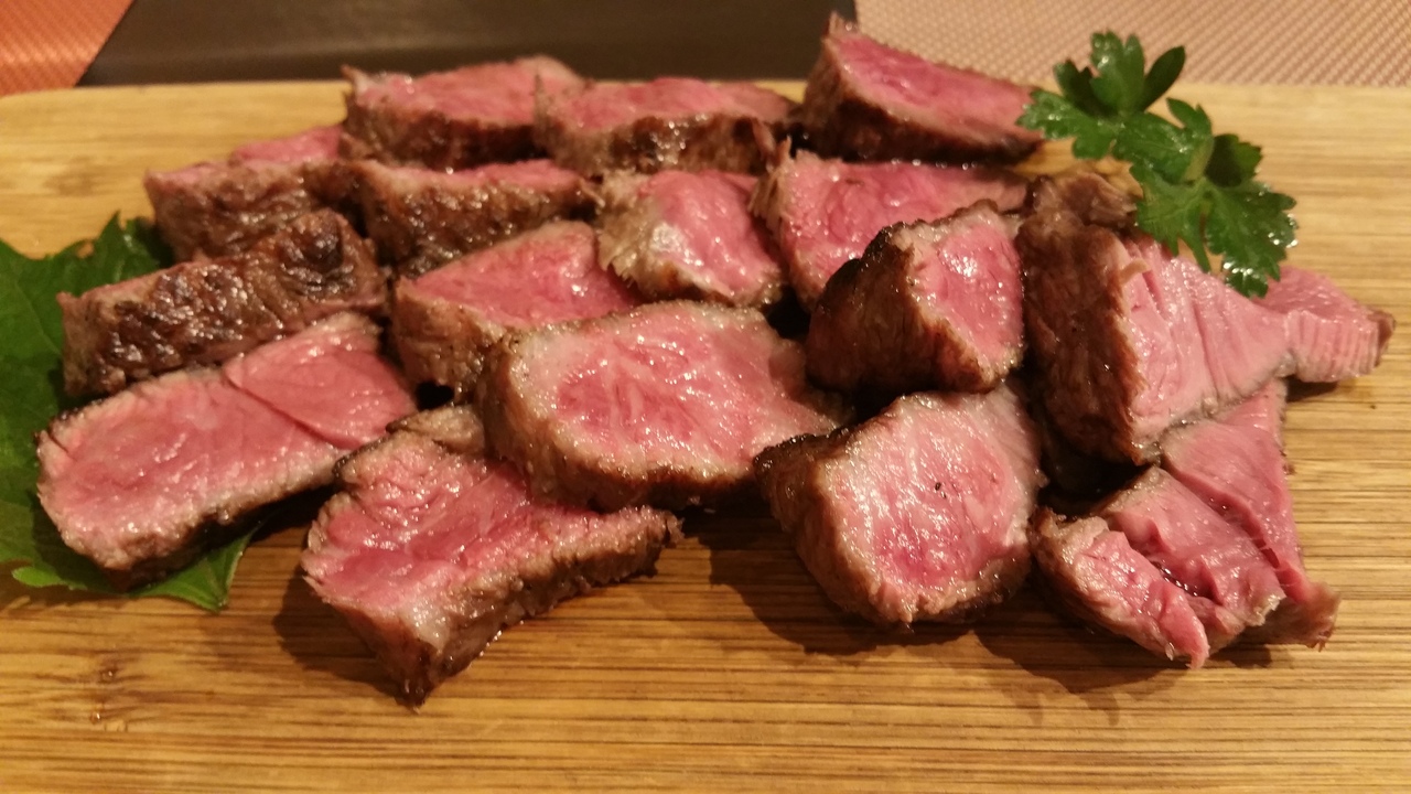 タコ、サーモン、ドレッシングがウマウマの海鮮サラダ。目も舌も満足な3種のタンのお刺身。珍しいテール焼はシンプルな塩コショウ味でウマウマ。岩塩、茎わさび、ガーリックチップス、ステーキソースで食べるレアがおいしい和牛タンは厚みがあってウマウマ。同じく岩塩、、、で食べる和牛モモ赤身レアステーキは炭火で焼かれた外は香ばしく中はやわらかレアでボリュームがあってウマウマ大満足。