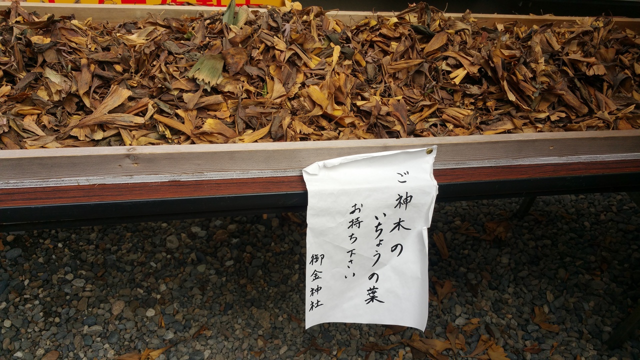 ご神木はいちょうの大樹で持ち帰れる葉っぱがおかれた台がありました。