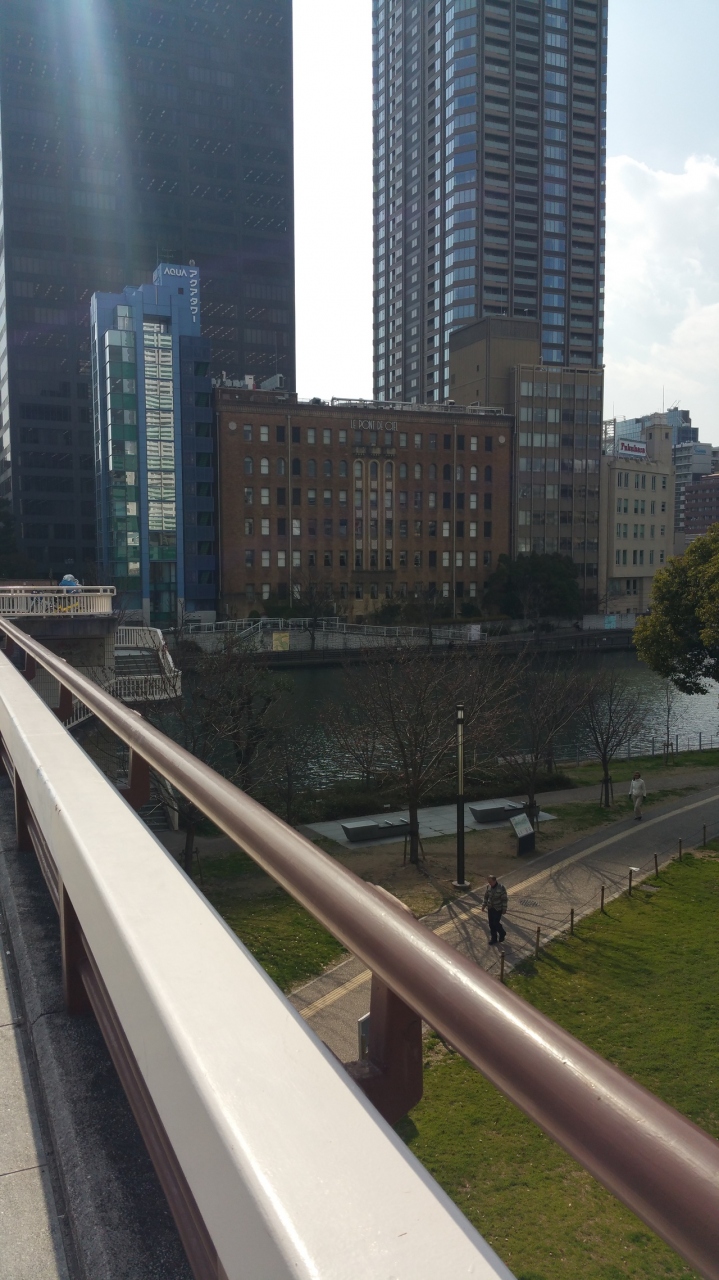 土佐堀川と土佐堀通りにはさまれた横に長いレトロなビルです。