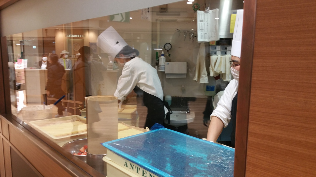 奥にはケーキをデコレーションしているところを見学できるガラス張りコーナーがあり、時間があればずっと見ていたいです。