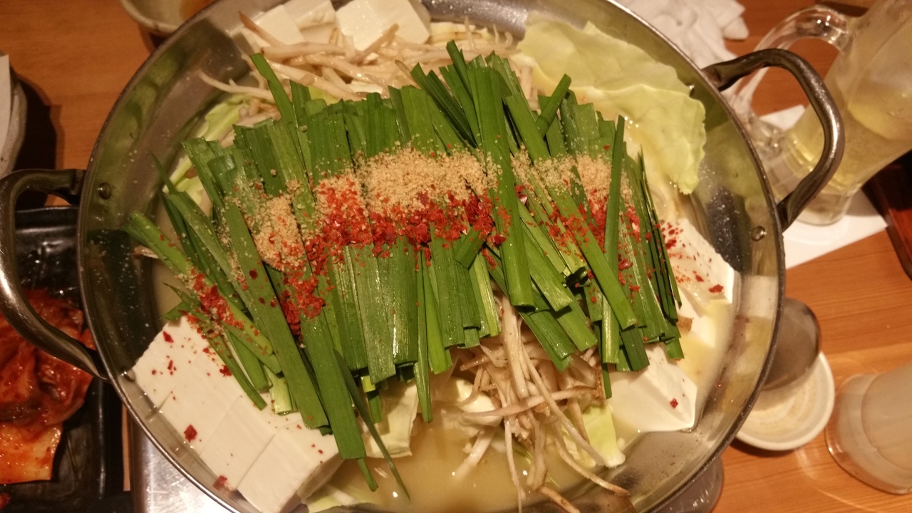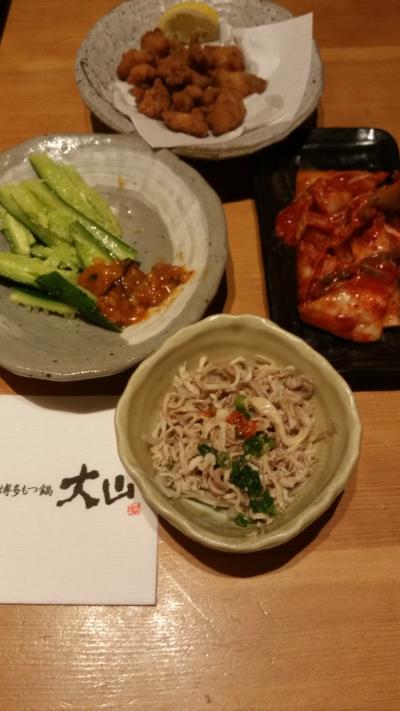 もつ鍋のほかに、キムチ、酢もつ、揚げ物(2種類)、焼き物がついて3980円でした。