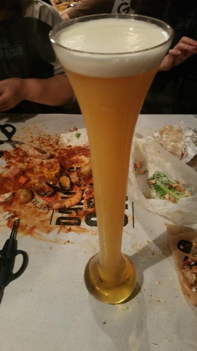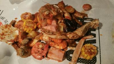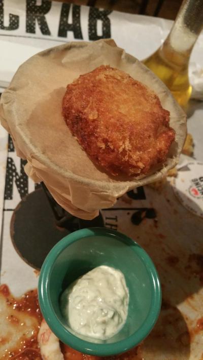 お料理を手づかみで食べるお店です。名物は魚介類や野菜にオリジナルソースがかかったバッグ。飲み物も見映えの面白いものがあります。時々ダンシングタイムがはじまり、店員さんが踊り出します。その際に誕生日のお客さんのお祝いも行われ、イベント性高い賑やかなお店です。気になった「クラブケーキ」はカニのほぐし身の揚げ物でした。