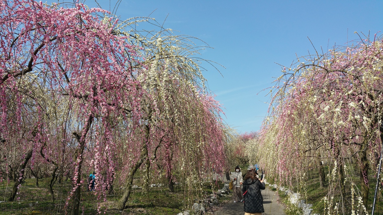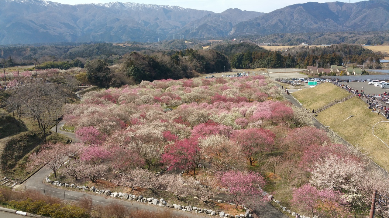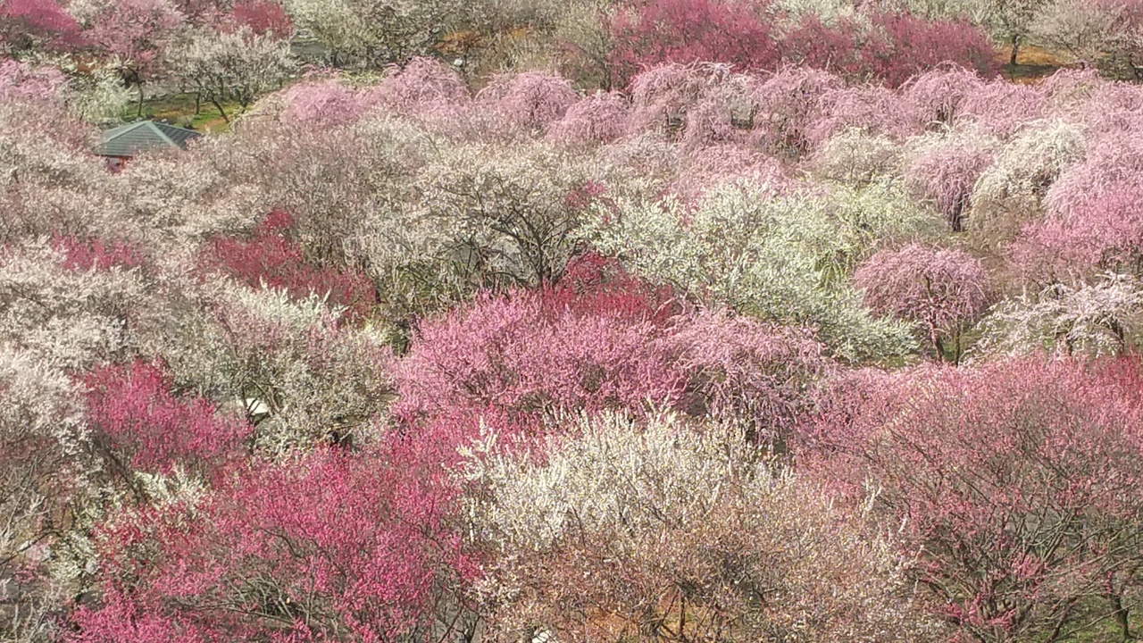 広い平坦な敷地に白、ピンク、紅の梅の花がたくさん咲いており、梅の香りに包まれます。
