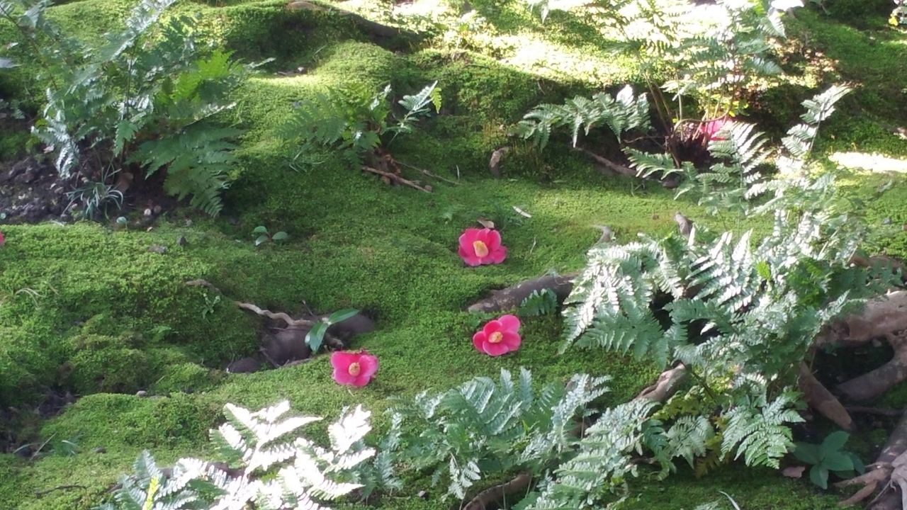梅エリアの奥にもみどりの苔に赤い散り椿が見られる素敵なスポットがあります。