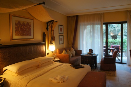 一番低いカテゴリーArabian Deluxeだったので眺望はよくありませんでした。景色にこだわる方はオーシャンビューの部屋をオススメします。約50?ありゆったりしていますが、ヴィラなどに滞在されリゾート慣れしている方にはごく普通に感じると思います。