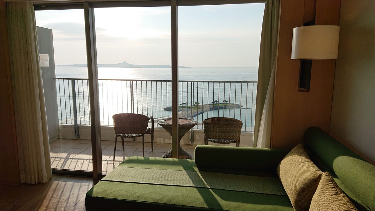 4年前に続き2回目の滞在でした。全室オーシャンビューでバルコニー付き。ロビーや客室など天井も高く感じて空間が広くてとても居心地がよいです。温泉も初めて利用しましたがアメニティも充実。お部屋から伊江島に沈む夕日の眺めが素晴らしいかったです。