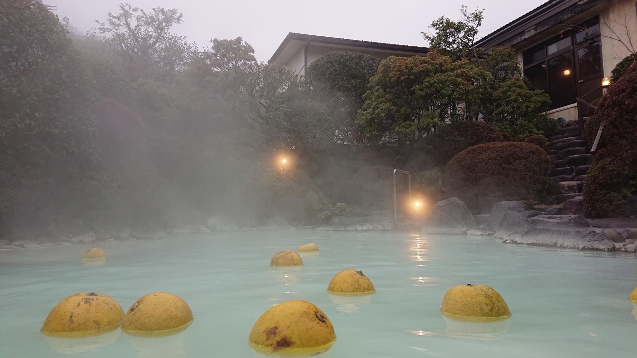 HPでみたままのミルキーブルーのお湯に黄色のザボンがいくつも浮いていて、映えています!