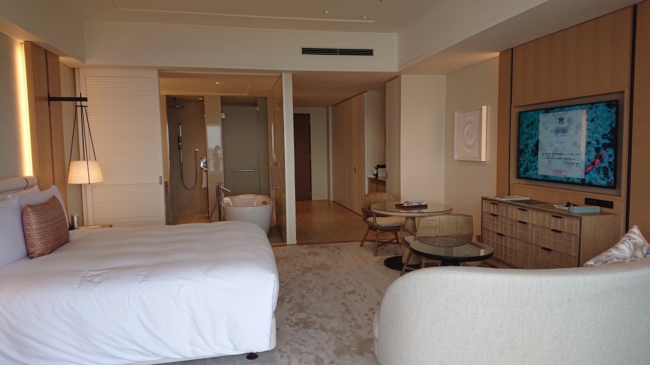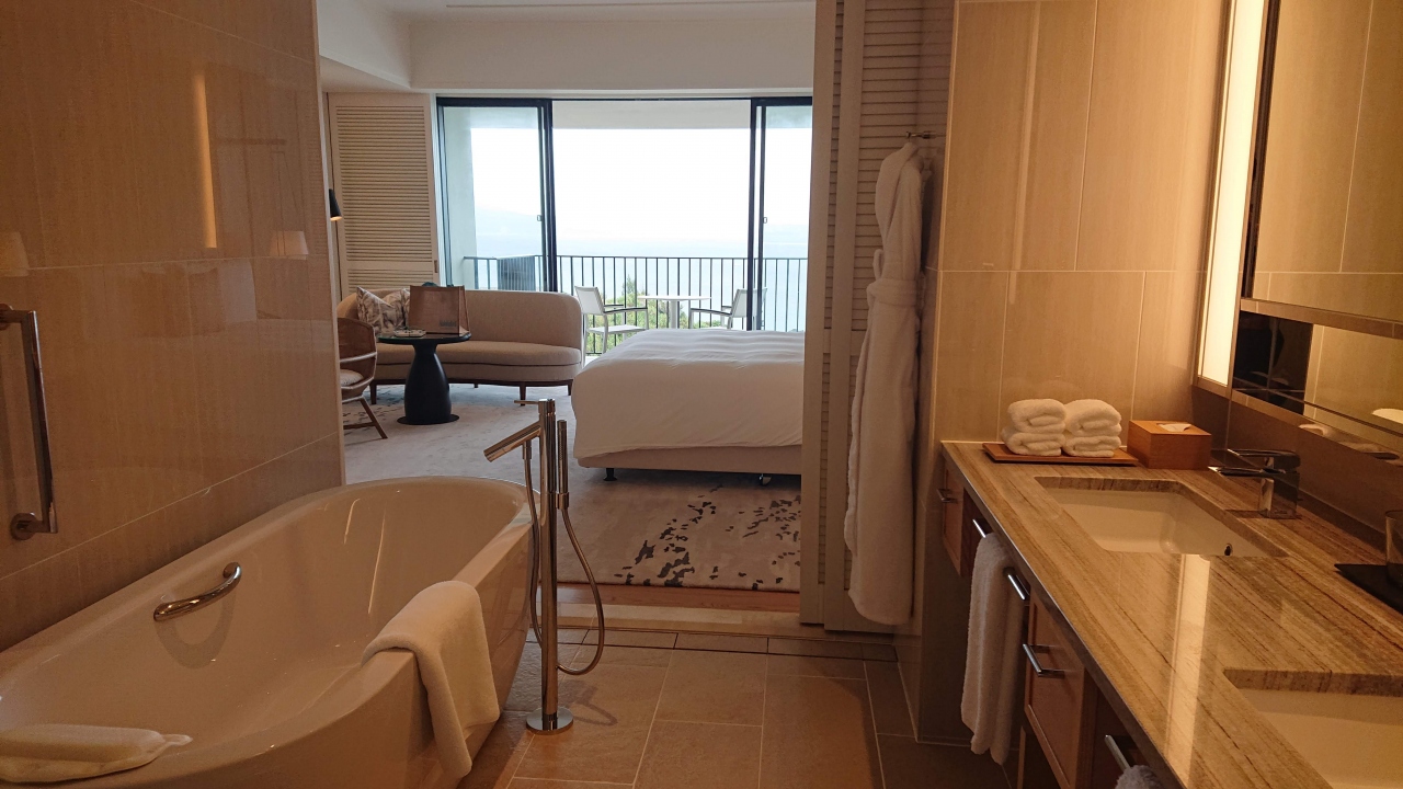 お部屋は全室50㎡のゆったりした造り。クローゼットも機能的で使いやすい。バスルームも開放的でありながら使いやすい。こんな部屋で数日間ずっとゴロゴロしていたい…