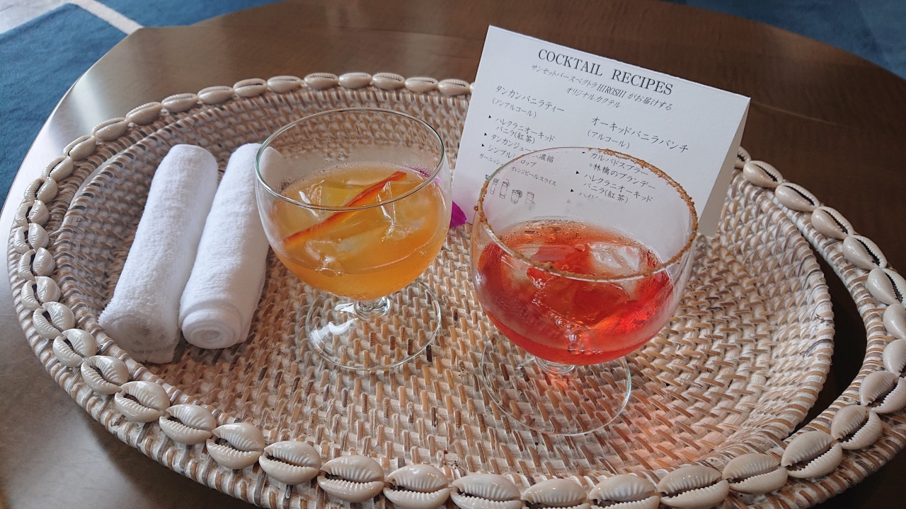 ホテル到着時のウェルカムドリンクはアルコールorノンアルコールからチョイス。アルコールが出てくるウェルカムドリンクのホテルは初めてかも…