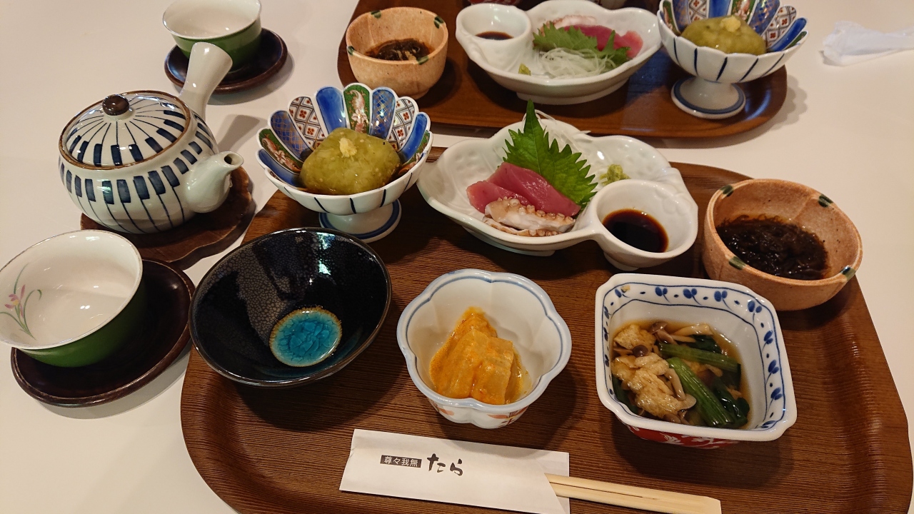 1日目は屋久島会席、2日目は尾野間会席で、量は多くはなく、めずらしい食材や高級な食材ではありませんが、地の素材をシンプルに一番おいしい状態でゆっくりと楽しませていいただきました。めったに飲まない焼酎もオーダーしてしまいました。