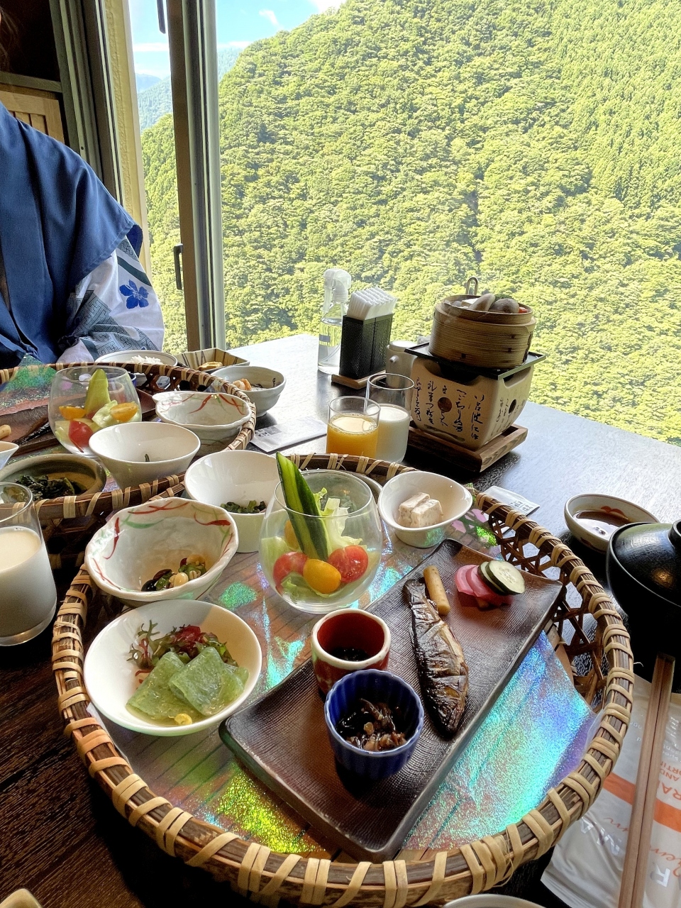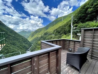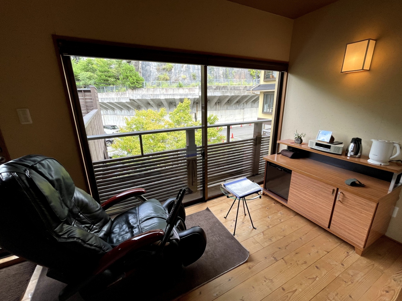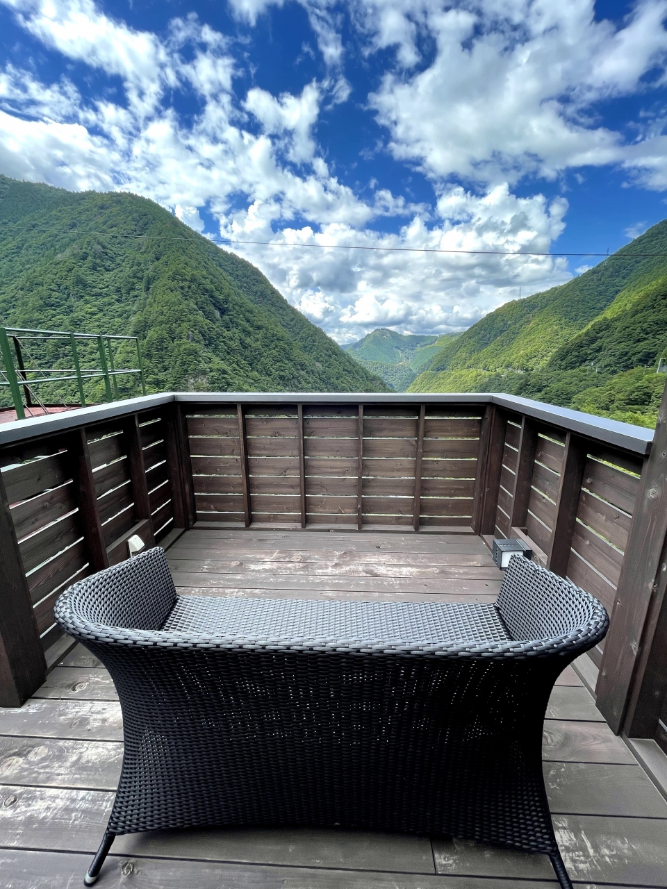 専用のバルコニーが付いていて渓谷の風景を独り占めしているかのよう。当日は残念ながら激しい夕立ちで星空や月は望めませんでしたが…とても使いやすいよいお部屋でした。