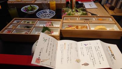 朝食の加賀能登朝食が素晴らしい。漆器の中には加賀能登の名物が所狭しと盛り込まれて、見た目も美しく味もおいしい。ここの朝食は最高です。そして、夕食も朝食も九谷焼の器などの華やかで優雅な気持ちになれました。