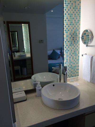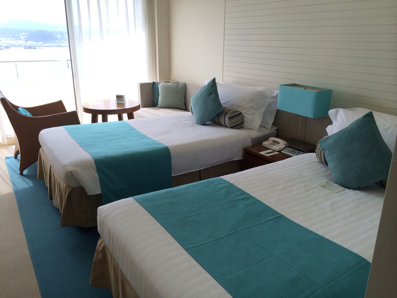 部屋を開けると青に統一された部屋や万座毛が一望できるオーシャンビュー。久々に声を出して感激しました!