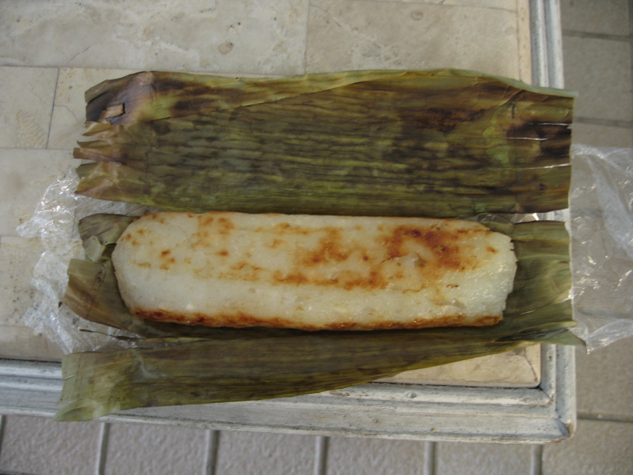 いつも旅行すると地元のお菓子を食べたくなるのは、お菓子好きなら誰もが共通して思うこと・・・。サイパンの素朴なお菓子「アピギギ」を紹介します。ココナッツとタピオカスターチ、砂糖、バターを混ぜて作っているお菓子です。噛んだとたんココナッツの味が口に広がる甘~いものです。グランドホテル近くにある「ジョーテンショッピングセンター」にて、1.25ドルで購入しました。入口近くのデリコーナーに置いてあります。