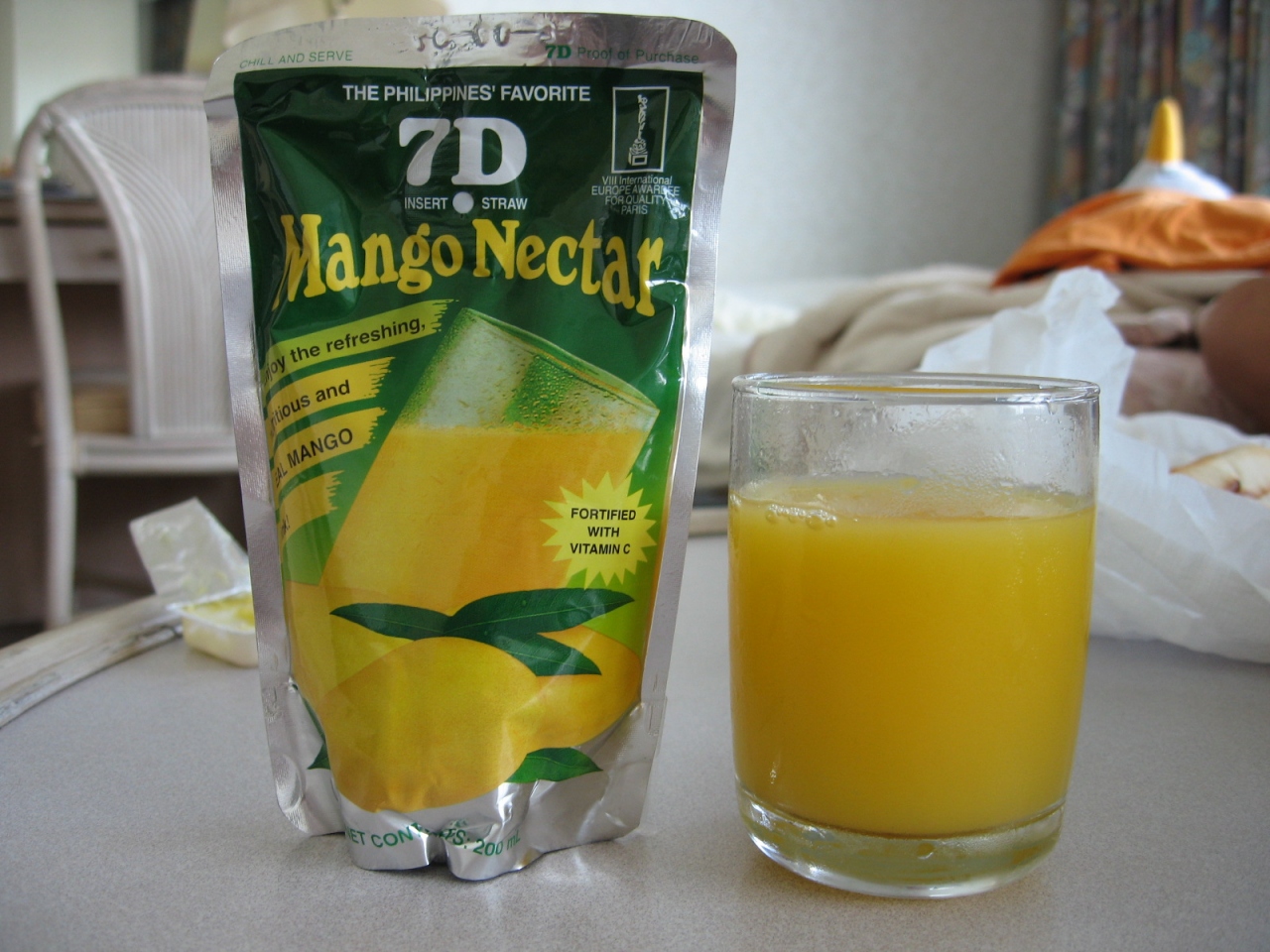 7Dドライマンゴはお土産としてお勧めでよく話題に上がります。そのネクター版も凍らせて、ビーチ・プールに出掛け、溶けかけところを、ストローで飲む!これ、お勧めです!だいたい、地元のショッピングセンターで購入が可能です。ちなみに、私達はホテルの近くにある「ジョーテンショッピングセンター」で購入しました。1つ25セント!!!25セントでこの味わいは日本では考えられません。お土産としても。超~お勧めです。しかし、10コ、20個の購入となると、結構な重さになるので、持ち込み荷物の重量制限に気をつけて下さい。