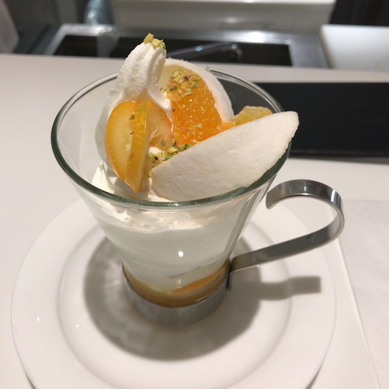 その季節のフルーツを使ったパフェに、リキュールと、リキュールで煮込んだあたたかいソースをかけていただきます。