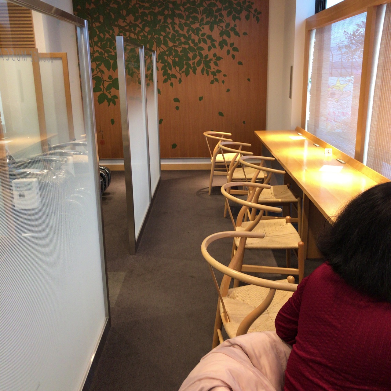 制限エリアの外にあり、展望デッキ入口手前に入口があるので、カウンター席は展望デッキの後ろになり、ラウンジ内から離発着を見ることも可能。