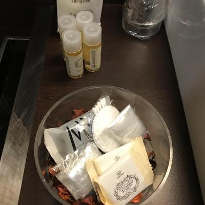 アメニティは石鹸、シャワージェル・シャンプー、コットンパフ、綿棒、シャワーキャップ、靴磨き