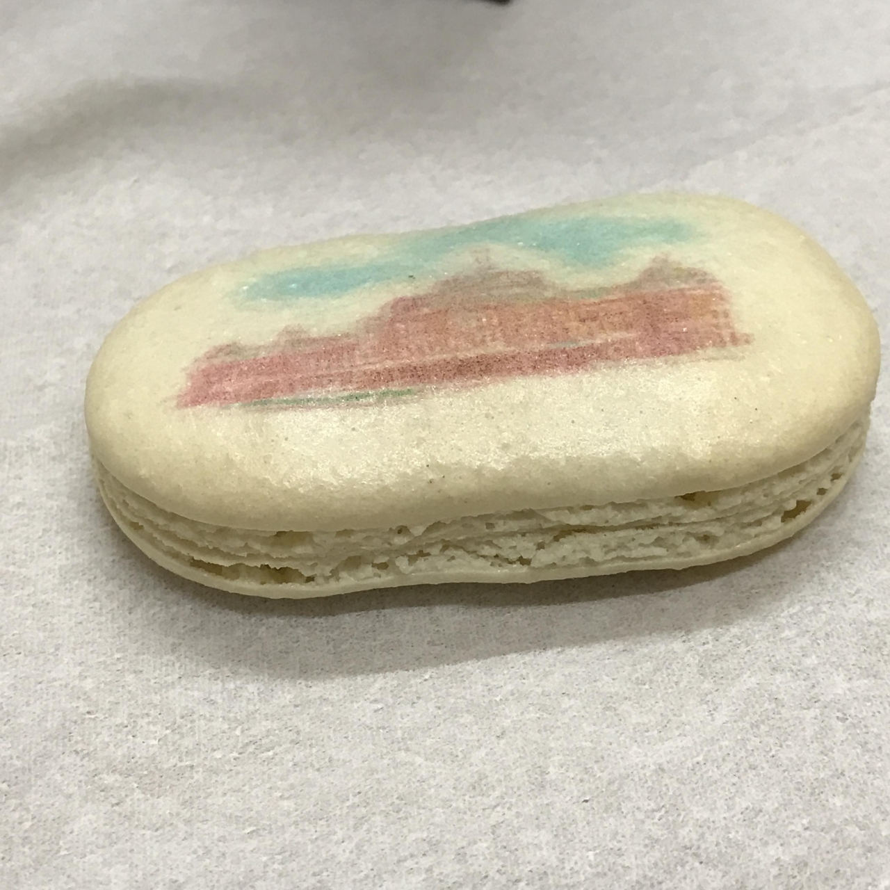 ラムレーズンとクリームをサンドした、レーズンウィッチのようなマカロンで、東京駅の絵柄がついています。