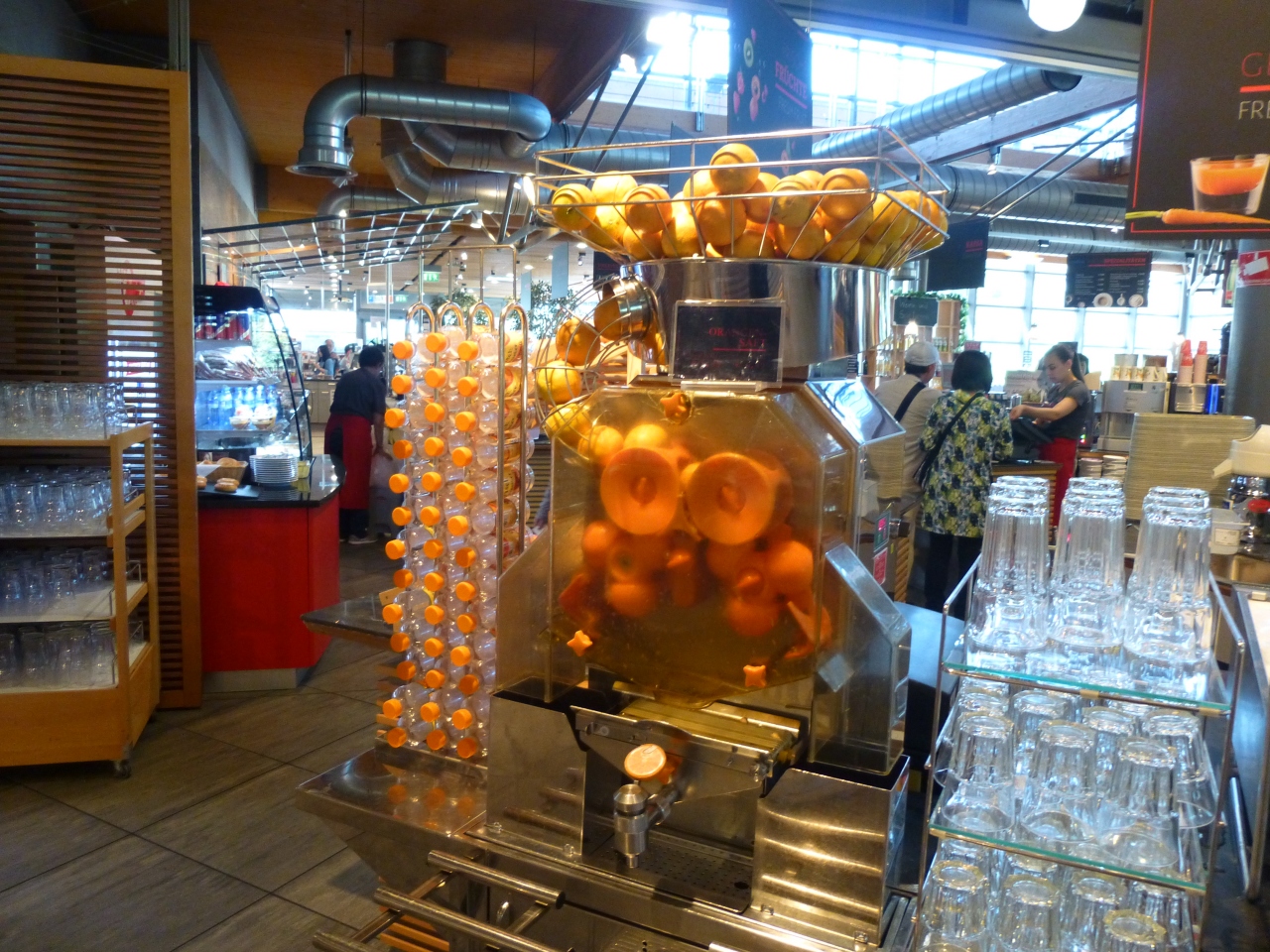 オレンジの絞りマシーンがあったり、フルーツのフレッシュジュース各種、魅力的カフェメニュー、スイーツにパン。